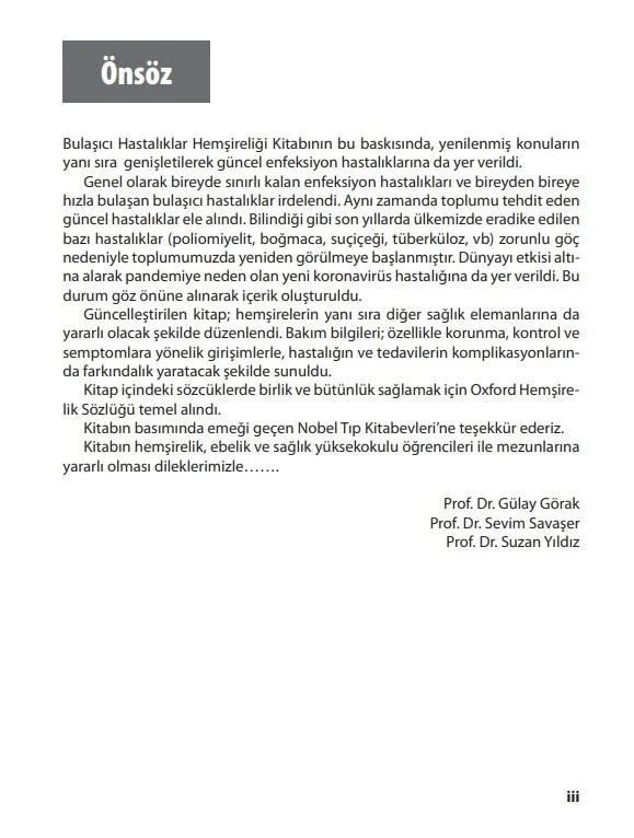 Bulaşıcı Hastalıklar Hemşireliği Kitabının bu baskısında yenilenmiş konuların yanı sıra genişletilerek güncel enfeksiyon hastalıklarına da yer verildi. Genel olarak bireyde sınırlı kalan enfeksiyon hastalıkları ve bireyden bireye hızla bulaşan bulaşıcı hastalıklar irdelendi. Aynı zamanda toplumu tehdit eden güncel hastalıklar ele alındı. Bilindiği gibi son yıllarda ülkemizde eradike edilen bazı hastalıklar (poliomiyelit, boğmaca, suçiçeği, tüberküloz, vb) zorunlu göç nedeniyle toplumumuzda yeniden görülmeye başlanmıştır. Dünyayı etkisi altına alarak pandemiye neden olan yeni koronavirüs hastalığına da yer verildi. Bu durum göz önüne alınarak içerik oluşturuldu. Güncelleştirilen kitap hemşirelerin yanı sıra diğer sağlık elemanlarına da yararlı olacak şekilde düzenlendi. Bakım bilgileri özellikle korunma kontrol ve semptomlara yönelik girişimlerle hastalığın ve tedavilerin komplikasyonlarında farkındalık yaratacak şekilde sunuldu. Kitap içindeki sözcüklerde birlik ve bütünlük sağlamak için Oxford Hemşirelik Sözlüğü temel alındı. Kitabın basımında emeği geçen Nobel Tıp Kitabevleri’ne teşekkür ederiz. Kitabın hemşirelik ebelik ve sağlık yüksekokulu öğrencileri ile mezunlarına yararlı olması dileklerimizle……. Prof. Dr. Gülay Görak Prof. Dr. Sevim Savaşer Prof. Dr. Suzan Yıldız